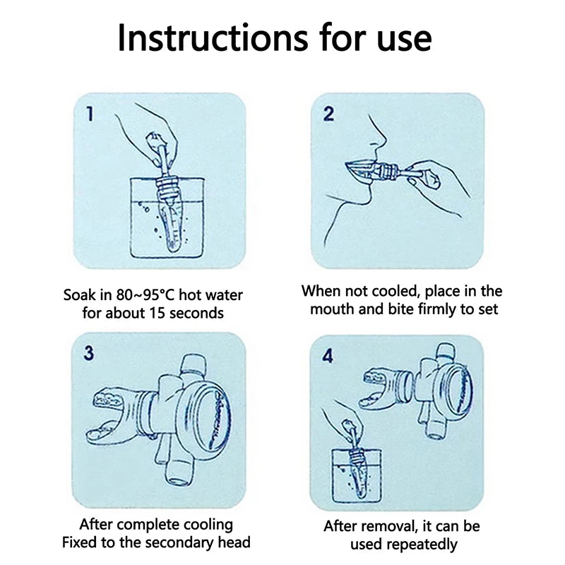 Vestibilità su Misura, Grazie alla Termoformabilità: Questo boccaglio non è un accessorio universale, ma un vero e proprio capo d'abbigliamento personalizzato. Grazie alla sua capacità di essere termoformato, si adatta perfettamente alla forma della tua bocca, dei tuoi denti e della tua mascella. Il risultato? Una tenuta sicura e un comfort che non hai mai provato prima.