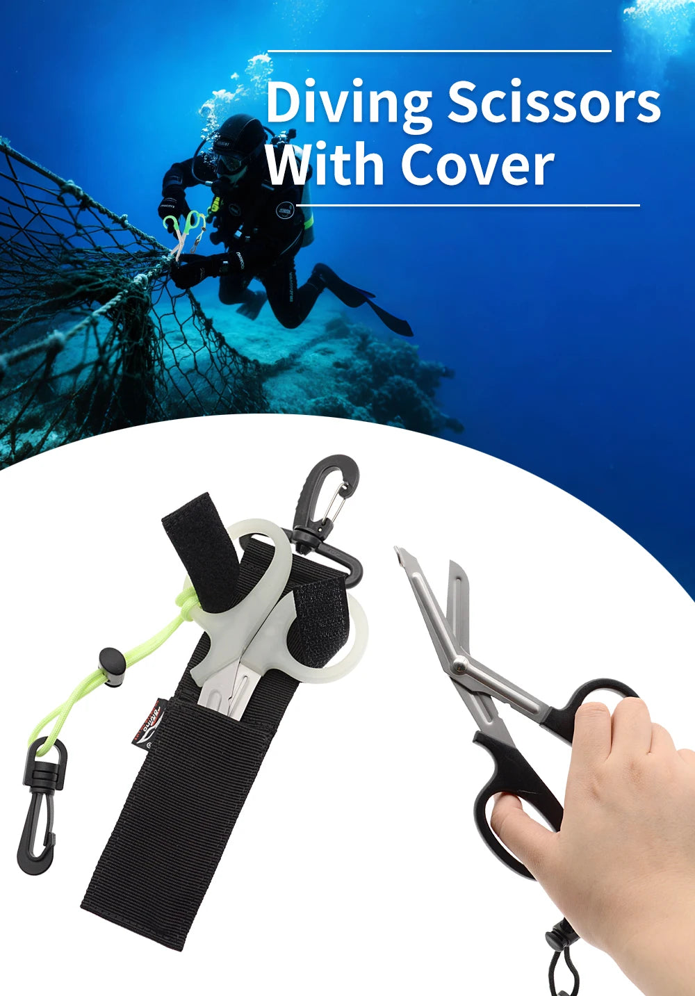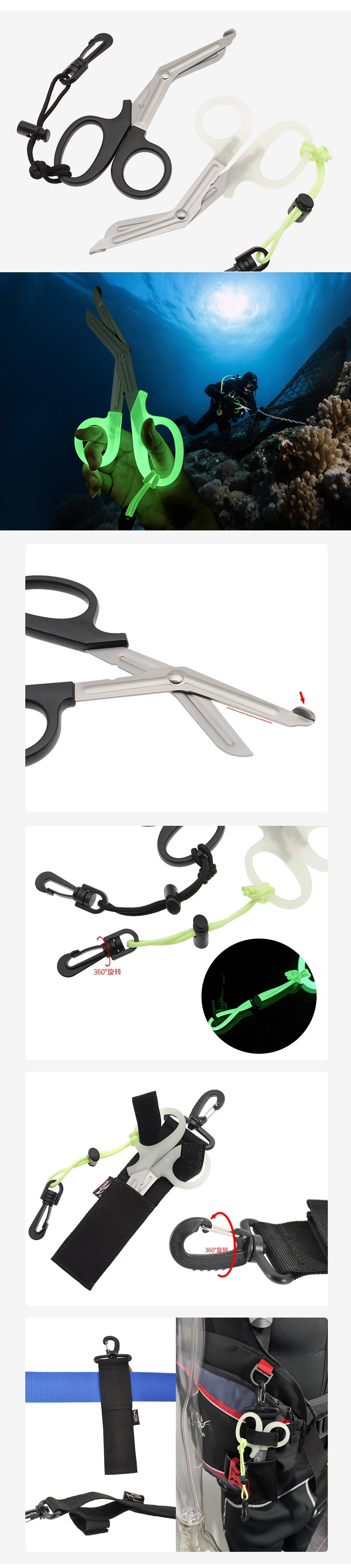 Sicurezza in Condizioni Estreme: Il manico luminoso (nella versione bianca) assorbe la luce e brilla nel buio. Questo ti permette di individuare e afferrare le forbici in un attimo, anche in condizioni di scarsa visibilità o durante le immersioni notturne.