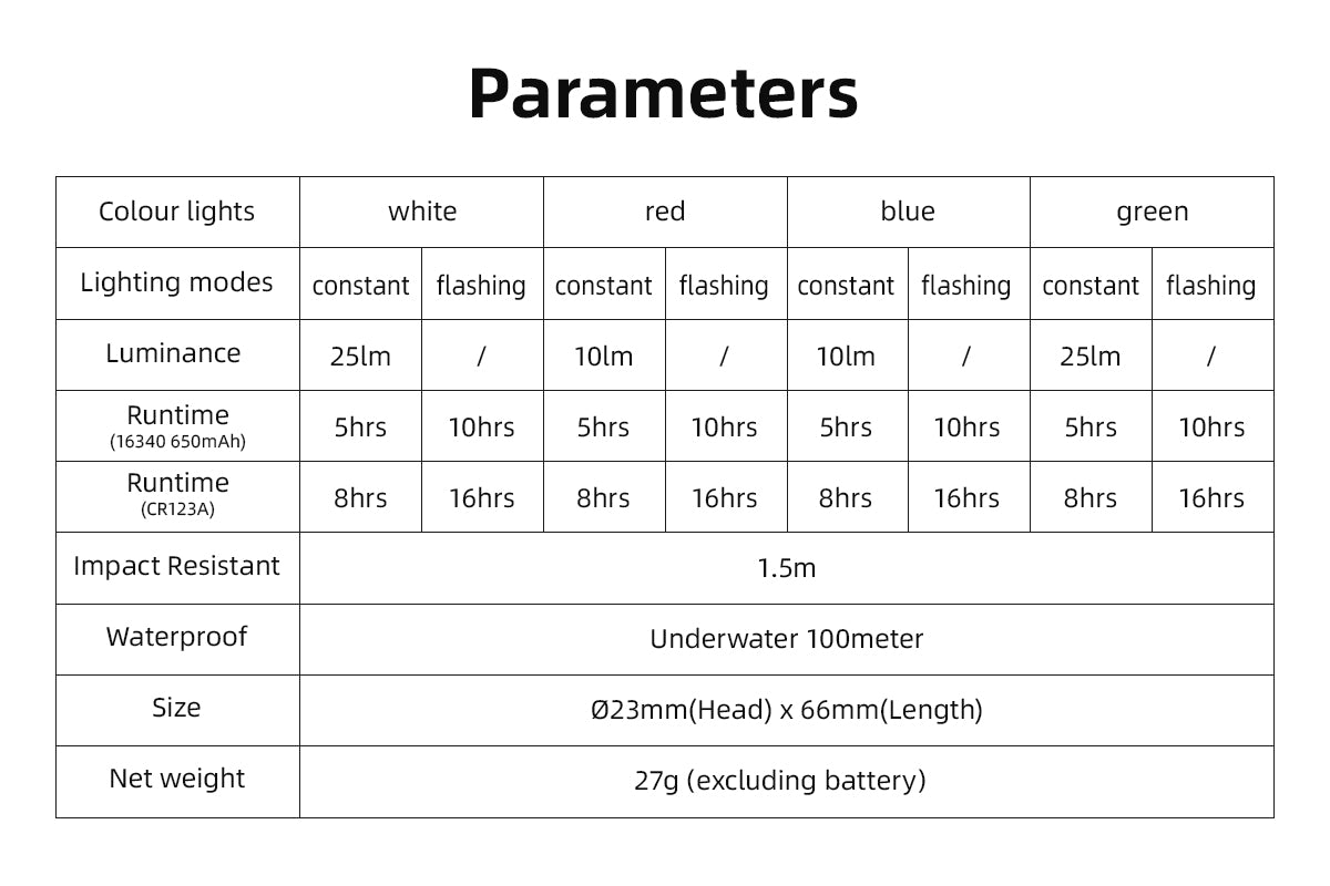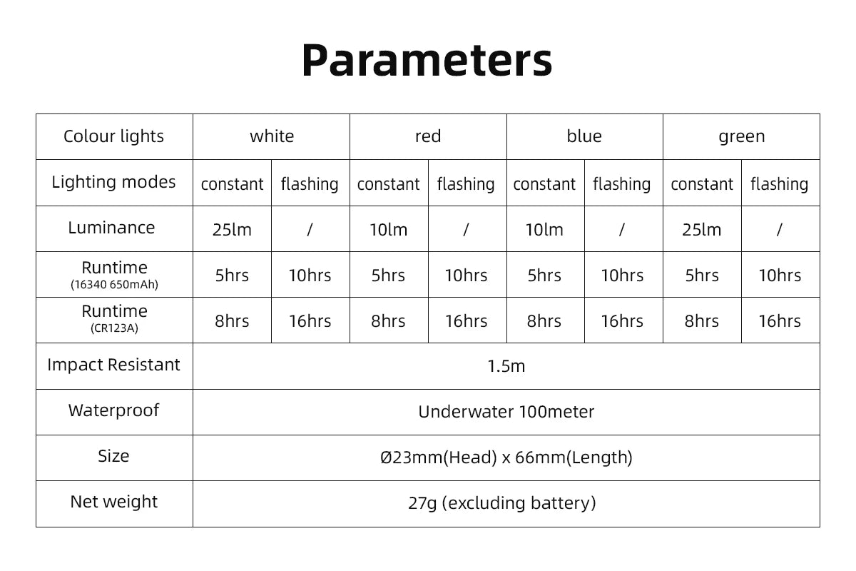 Modalità luce: 8 (Bianco fisso / Bianco flash / Rosso fisso / Rosso flash / Blu fisso / Blu flash / Verde fisso / Verde flash)